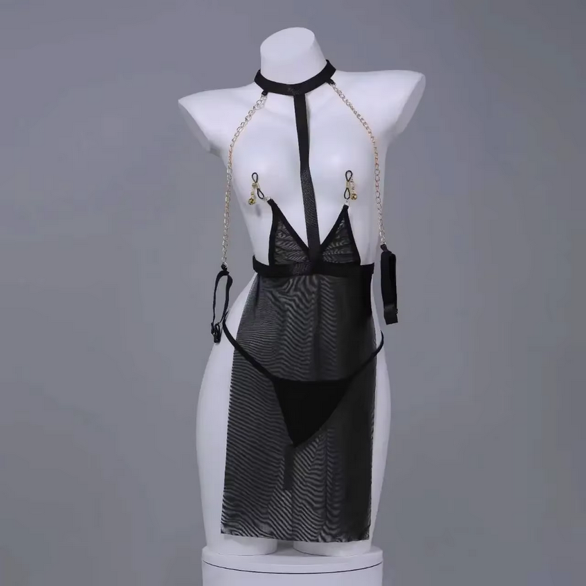 Plongez dans l’univers du glamour sensuel et du bondage chic avec cette nuisette sexy transparente noire. Élégante et provocante, elle est conçue pour sublimer le corps féminin tout en jouant sur le mystère et la domination. Son design unique allie la délicatesse du tissu en voile noir à la puissance des chaînes dorées et des pinces à tétons réglables, créant un équilibre parfait entre séduction et audace.