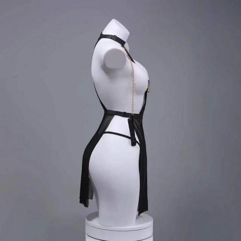 Cette nuisette bondage se porte idéalement avec son string noir assorti pour un effet complet, ou simplement seule pour une allure dominatrice et envoûtante. Le contraste entre la légèreté du tissu et la froideur des chaînes dorées symbolise la dualité entre douceur et pouvoir, faisant de cette pièce un must-have de la lingerie érotique.