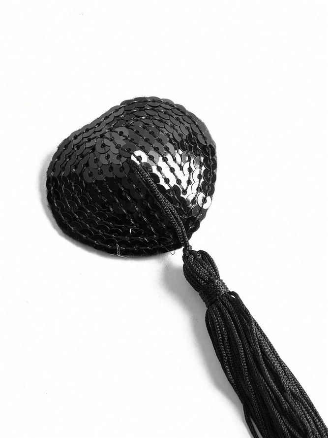 Pour compléter ce look, l’ensemble est accompagné de cache-tétons noirs à sequins et pompons, parfaits pour un effet cabaret glamour et burlesque. Ces accessoires apportent un côté festif et osé, idéal pour une soirée intime ou une mise en scène sensuelle.