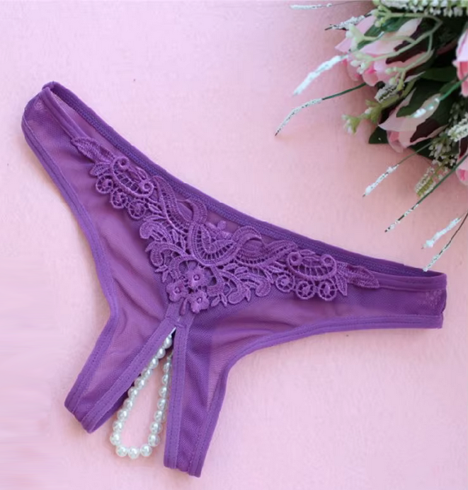 Donnez un peu de fantaisie à votre minou avec ce string violet en mesh à perles !