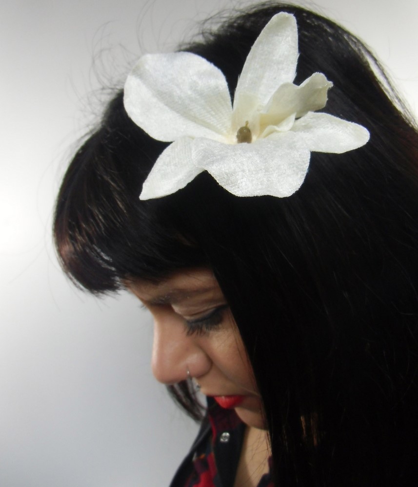 Parez votre coiffure pin-up d'une fleur d'orchidée en tissu épais.