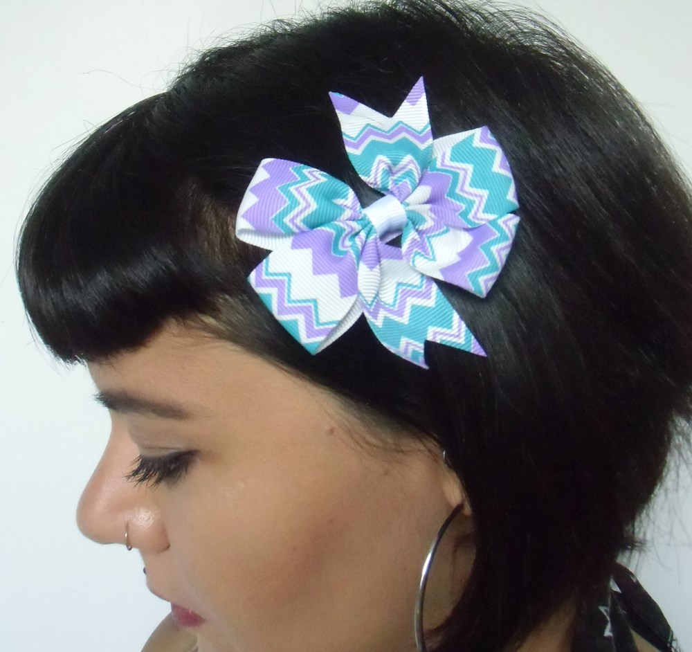 Pince clip à cheveux noeud tissu zigzag pastel "Purple & green bow"