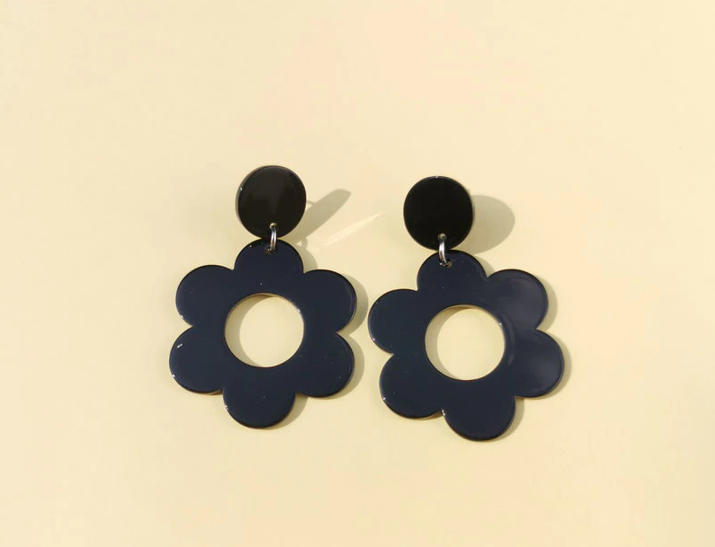 Cette paire de boucles d'oreilles originales se compose d'une fleur noire en acrylique sur chaque oreille !
