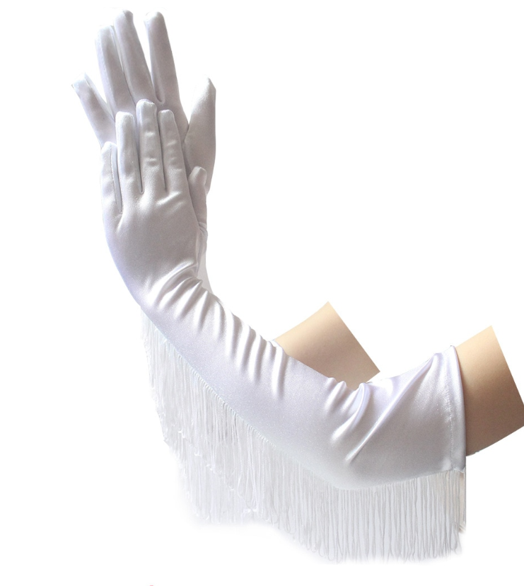 Cette paire de gants longs blancs en satin (50cm de longueur environ) sont ornés de franges résolument rétro !