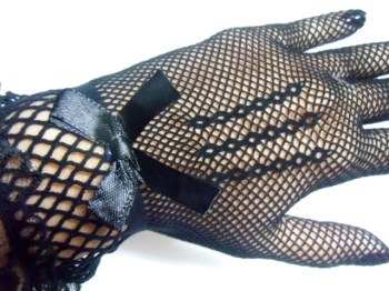 Ces gants courts en résille extensible sont ornées de 3 chainettes décoratives sur le plat de la main, d'un noeud satiné et de dentelle au poignet.