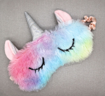 En forme de tête de licorne, ce masque de sommeil est en peluche couleur arc-en-ciel ultra douce.