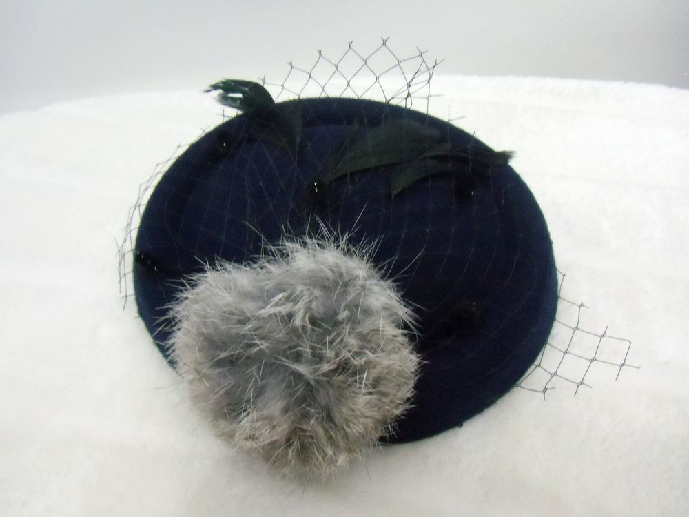 Il est en feutre bleu marine épais et orné d'une petite voilette de coquetterie en résille à plumetis décorées de plumes noires.