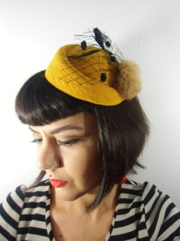 Il est en feutre jaune moutarde épais et orné d'une petite voilette de coquetterie en résille à plumetis décorées de plumes noires.