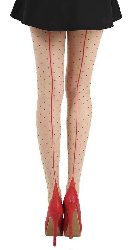 Ces collants chair sont ornés d'une couture et de pois rouges pour une touche rétro, sexy et colorée !