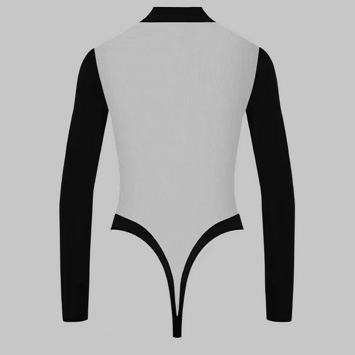 Les manches longues ajustées apportent une touche élégante et contrastent parfaitement avec la coupe échancrée du bas. Le col ras-du-cou intégré renforce l’aspect moderne du modèle et accentue la dimension mode de cette lingerie sexy. À l’arrière, le dos entièrement en mesh transparent révèle la peau avec finesse, offrant une vision sensuelle et irrésistible qui sublime les courbes naturelles.