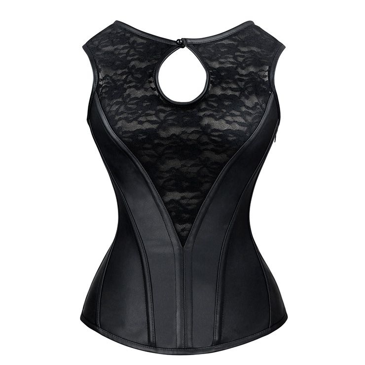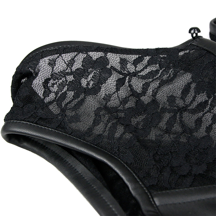 Il est en simili-cuir noir, avec une partie en dentelle noire transparente sur la poitrine et le haut du dos.