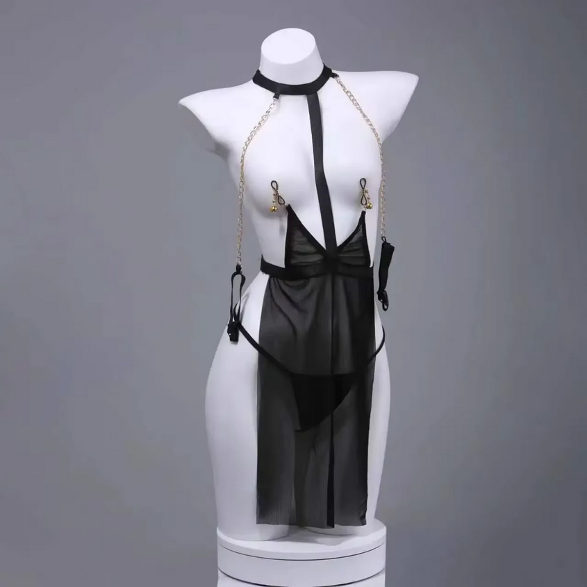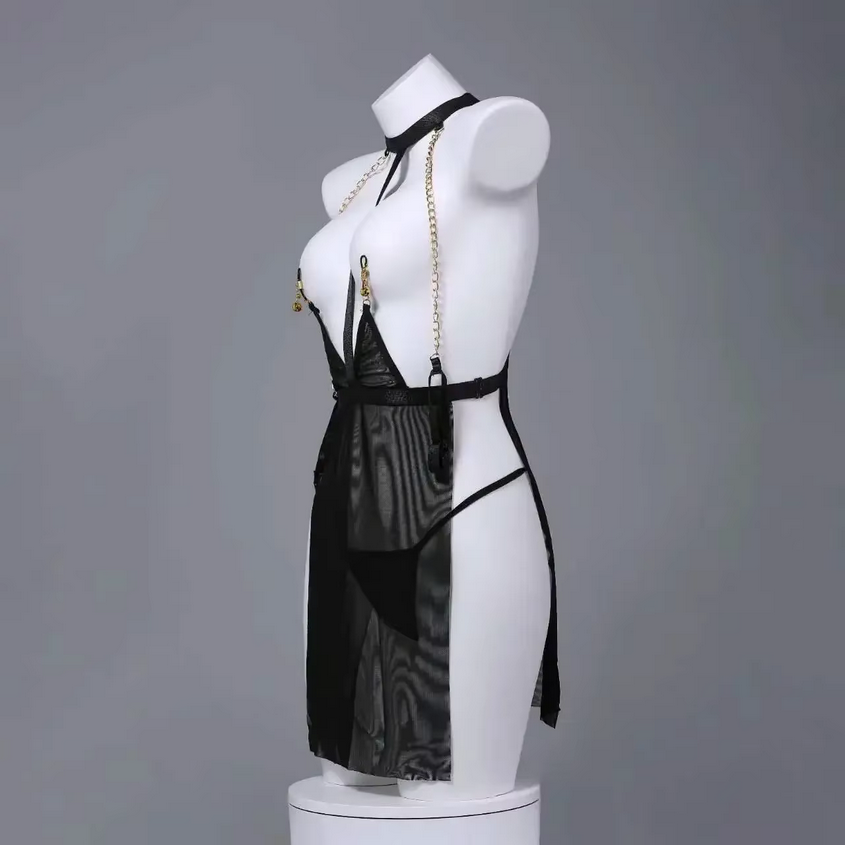 Plongez dans l’univers du glamour sensuel et du bondage chic avec cette nuisette sexy transparente noire. Élégante et provocante, elle est conçue pour sublimer le corps féminin tout en jouant sur le mystère et la domination. Son design unique allie la délicatesse du tissu en voile noir à la puissance des chaînes dorées et des pinces à tétons réglables, créant un équilibre parfait entre séduction et audace.